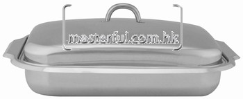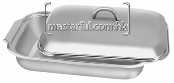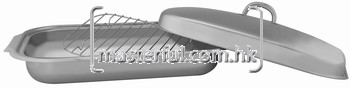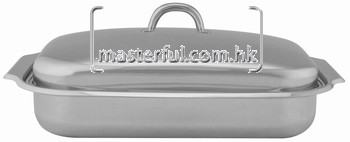 Roasting pan, 0.8mm body with wire rack and lid, lid in 0.6mm with hollow handle, 18/8 s/s, overall size 343 x 216 x 58mm