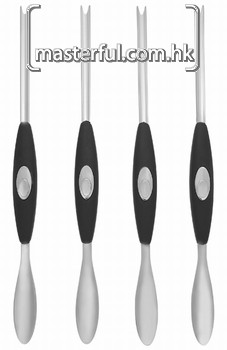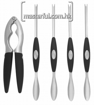 Seafood cracker and four scoop / picks, chrome plated buttom soft grip and s/s mirror finish fork ends,