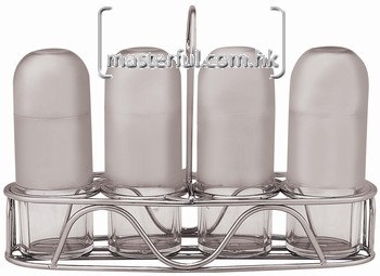 Spice bottles, set of 4, on wire stand. Bottles in 10cm length, s/s, with clear plastic bottom and s/s covers. Set includes 2 each of round (2B) & oval (2A) hole tops